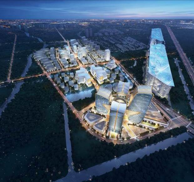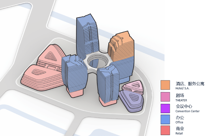 设计结合片区整体规划,将形象科创中轴大道作为10-01A、10-01B地块中轴,包含商业、办公、会议中心、剧场、酒店以及服务公寓丰富业态在内的建筑群,沿轴线对称布局,在多元的城市休闲文化空间与业态功能互联互通中,以地标性轮廓打造出工作-娱乐一体化高端商务综合片区。