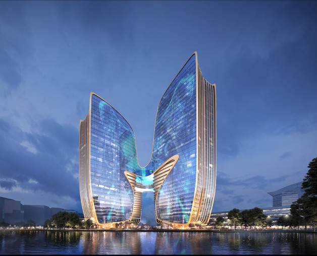 四座高低错落的塔楼作为地块的核心,设计以“科创蝶变”为概念,高层部分由中心向外层层退进,形成流线型的建筑轮廓,从不同角度看去,相邻的两座塔楼都如振翅高飞的蝴蝶,而环形连桥则如同 “科创之眼”,诠释科技、自然、艺术的相互交融。塔楼向心一侧从首层到连桥以下采用透明玻璃幕墙搭配横向铝板,并通过金色铝板线条与外侧幕墙形成分隔。当夜晚来临,中心暖黄色的灯光与外部幕墙在灵动的铝板线条分隔下形成鲜明对比,整座建筑犹如破茧而出的蝴蝶,寓意片区的蓬勃发展与无限生命力。