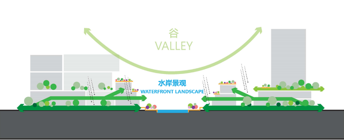 呈矩形的地块被蒋家浜南北向贯穿,团队充分利用这一地形条件,提出了“智慧蝶谷”的设计概念。建筑群以河道为轴心,呈现中间低两边高的河谷形态,并通过露台空间,将河道景观资源最大化,营造出绿色宜人的办公氛围。同时,设计在河道两旁打造了丰富的生态城市公共空间以及下沉广场,商务会谈、餐饮聚会、水畔慢跑都将在此发生,形成促进“工作-生活”平衡的未来“科创引力场”。