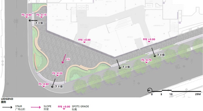 原本的广场景观空间内向且封闭,流线混乱,缺乏吸引力。为了激活街角空间,设计着重梳理了场地的竖向关系,保证从城市界面到建筑内部形成无障碍的体验流线,同时留出足够的活动空间供市民休憩,创造一个舒适的城市公共空间。