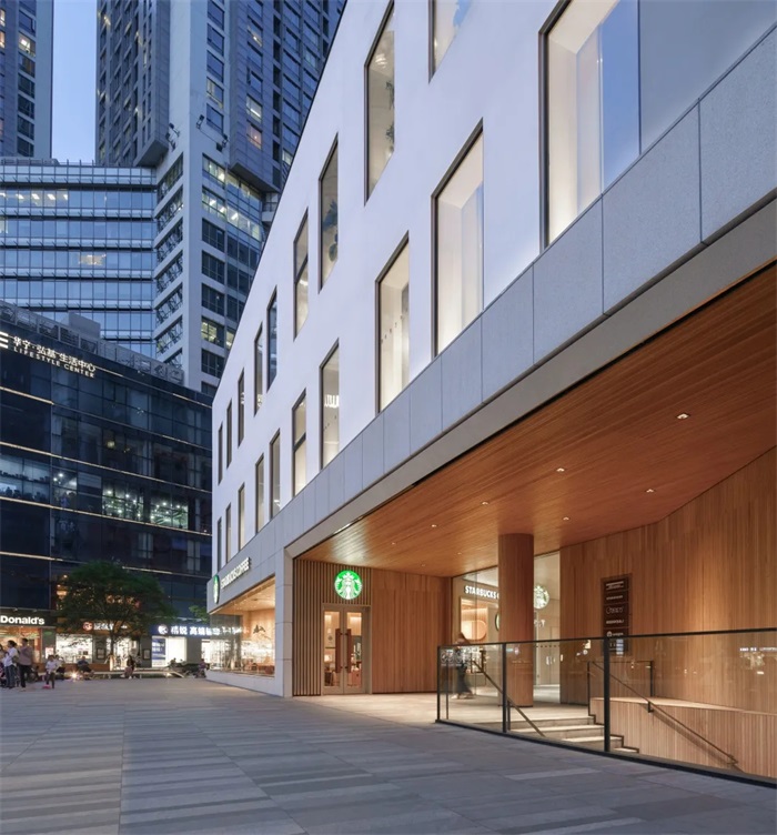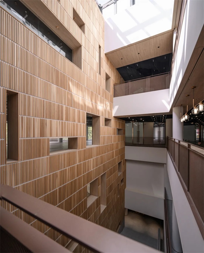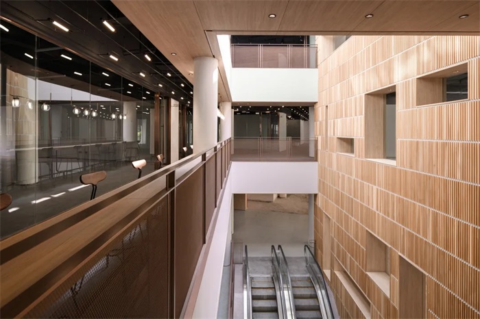 建筑内的商业和办公空间都以温暖的木饰面为主色调,通过木材与混凝土的组合营造出个性而又富有设计感的整体环境。