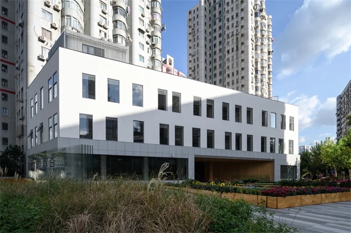 在建筑外立面的改造上,设计强调与现有环境的协调与互动。白天,纯白的墙面配以序列性排布的大落地窗,给人简洁有力的视觉冲击感,同时最大限度将室外光线与景观引入室内。
