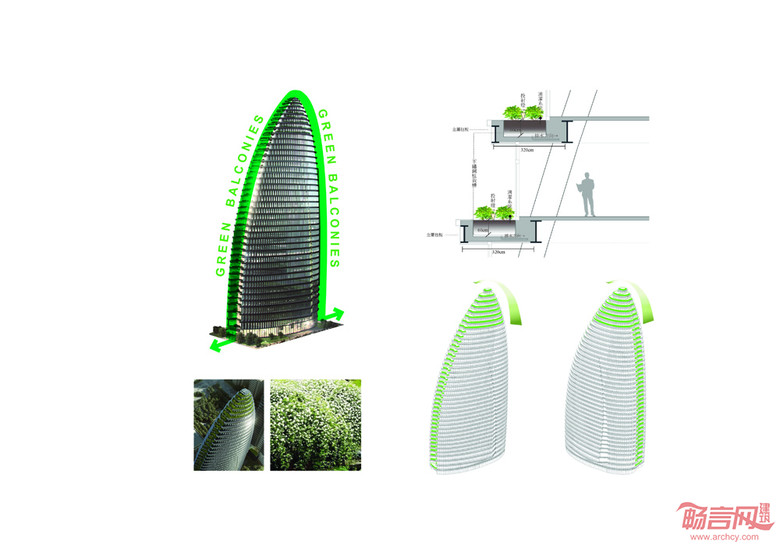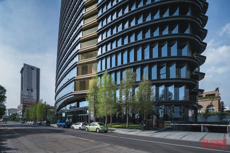 多切面立面采用水平遮阳篷、独特的防雨罩及玻璃窗墙,以突出建筑特征鲜明的流线形体曲线。椭圆形态允许办公区域最大程度的自然透光。东西立面及屋顶的垂直绿化均采用当地绿色植被,显著提高了能耗效率。北侧及东侧每层都设有阳台,提供享有宜人景致的室外体验。