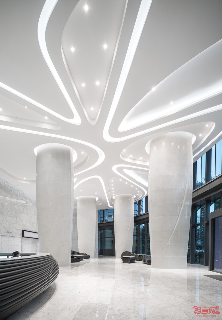室内空间的设计取意于传统水墨画——通过使用不同灰度的色调与渐变,配合灯光及反射,表达截然不同的感觉,营造中和而宁静的意境。两层裙楼设有银行及餐饮业态,激活临街的都市生活。