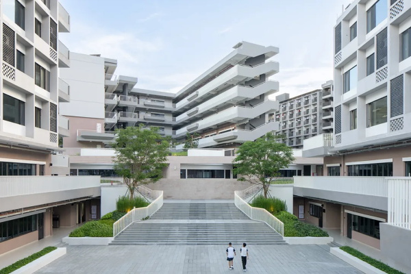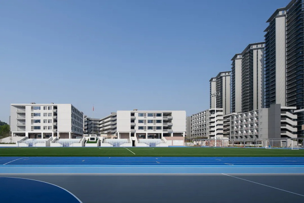 广州天健中学位于黄埔区长贤路,地处东部山水新城核心区域,北临帽峰山生态廊道,南接科学城先行区。校园选址在一片复杂山地,西高东低、南高北低,最大高差达20米。设计充分尊重场地条件,将教学、生活、艺体三大组团对应不同标高的三个平台布局,从西到东实现从自然环境向城市空间的过渡。建筑向内采用连续廊道与横向线条,向外则以单元组合立面呼应街道,形成疏密有致的空间节奏。