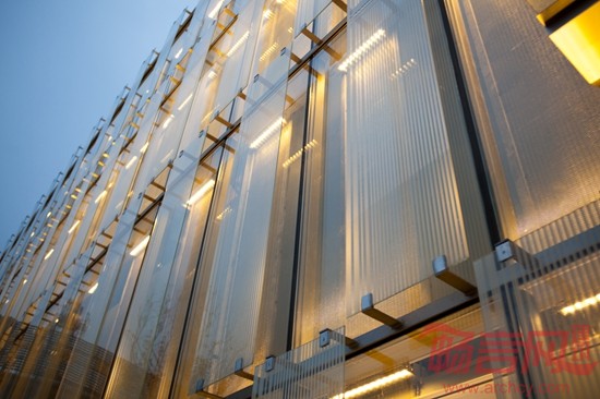进一步靠近时会发现,玻璃幕墙的设计虽然简洁但却不失细节,从内到外共分三层,依次为:金属网--中空玻璃--彩釉玻璃。最内侧的金属网通过有意图的随机组合衬于幕墙中空玻璃后,在白天若隐若现,形成独特的肌理感,在夜晚则能作为泛光照明的灯光载体,映射出波光粼粼的视觉效果。中间为玻璃幕墙主体,较高的透光率,很好的突出了内衬金属网的质感。最外层的彩釉玻璃百叶间隔排列,增加了幕墙的层次感,精心设计的白色条形纹理,由粗到细由疏到密,从北指向南,具有方向感,潜移默化的引导客人继续向前至主入口。