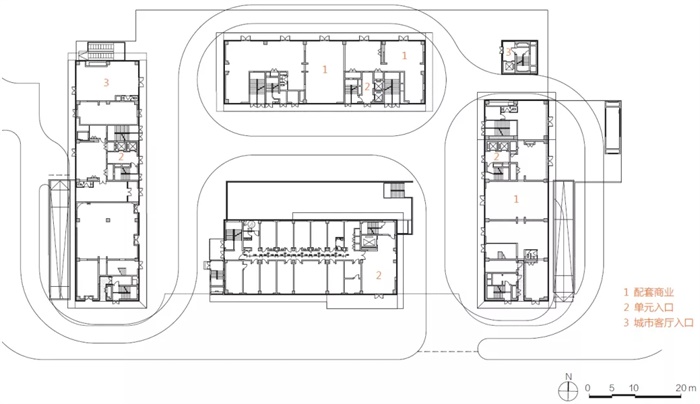 项目外围人流关系较复杂。西侧有跨三环的人行天桥、公交站点和商业配套,项目东向及北向是主要客群出行的方向,而项目南侧大量居住区的人流会通过穿行的方式进入项目内部,通往西侧商业区域、公交站点和天桥。通过分析项目周边环境的人流来向、公交线路及站点分布、居住客群出行路径等信息,方案主动打开角部空间,实现人流自然导入。东北角作为项目形象及主要出行人流的主出入口,借由抬升的城市客厅形成架空天幕和灰空间,进一步强化主入口形象,吸纳人流,激活内部庭院。同时,将居住功能抬升至三层及以上,在底层置入充分的商业配套,结合开放的公共庭院,使该项目不仅仅是个单一的居住社区产品,更重要的是形成该区域新的活力节点,创造更多元化的公共参与可能,这也是项目超越居住产品本身更关键的城市意义。