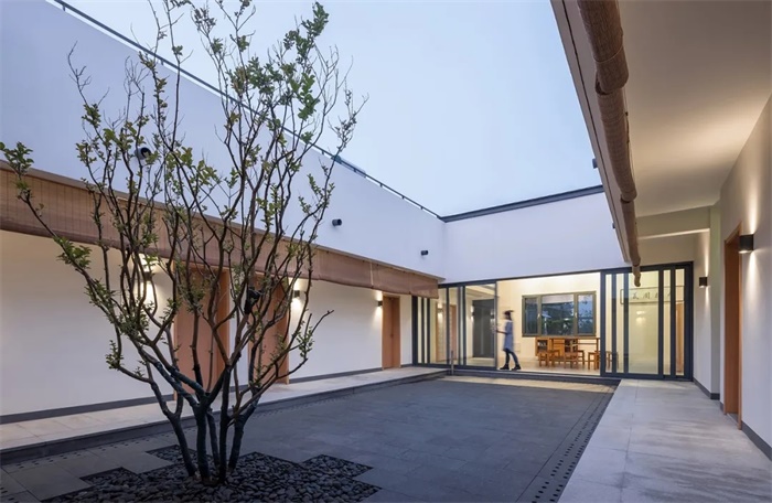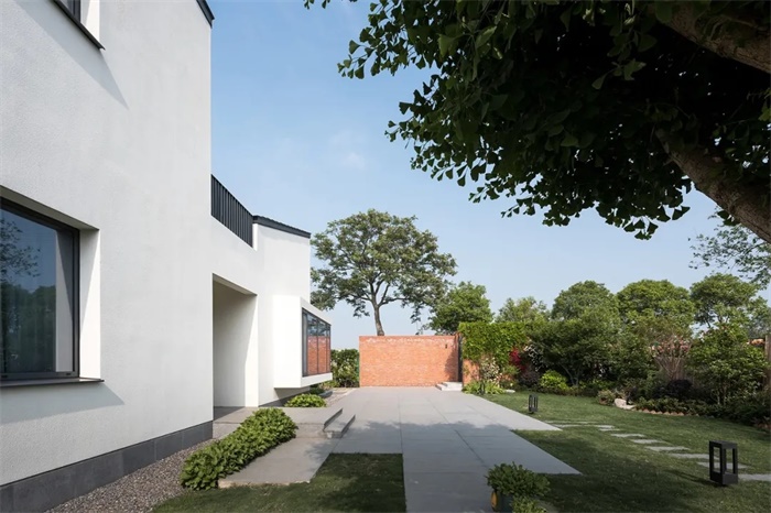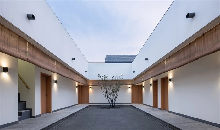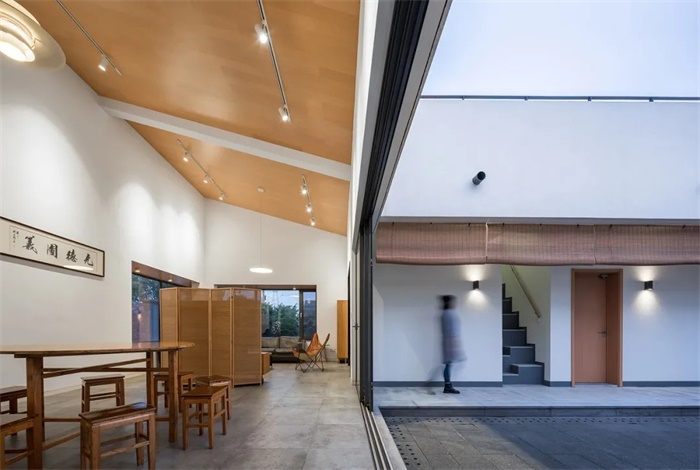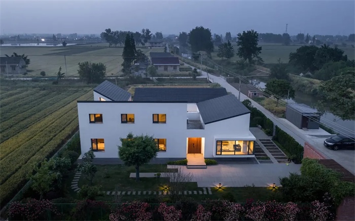 与传统合院建筑不同的是,住宅的坡屋面在每一侧做了局部的断开,成为风车形的四个独立屋面。下雨时,屋面的雨水汇集到内院,将传统的“水聚天心,四水归堂“的形制赋予了现代模样。居住空间通过院落的光影与景致联系在一起,充满场所感的日常生活氛围油然而生,勾勒出乡间生活的怡然自得与恬淡闲逸。
