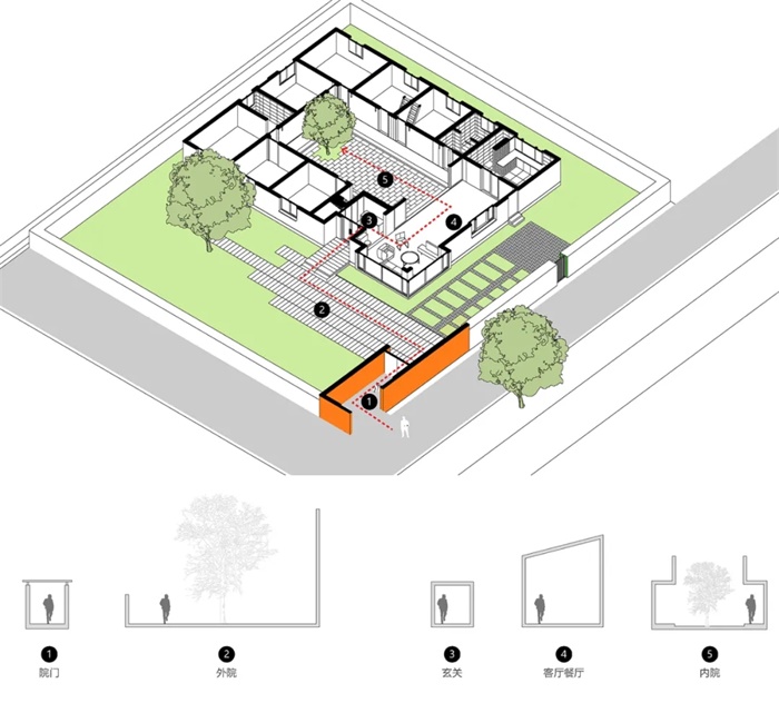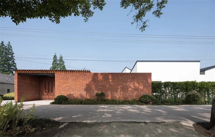 经过院门构成的过渡空间才可进入开阔的外院,院内的银杏和院外的大槐树成为内外两侧对景,承载着居者归家的礼序之感,也颇有移步异景的古典意趣。外院周边采用金属网围栏加绿篱维护家宅,同时弱化了硬性围合,保留建筑与田野邻里间的关系。院子东侧的“一米菜园”让年长的父母依然可以延续播种收获的快乐。