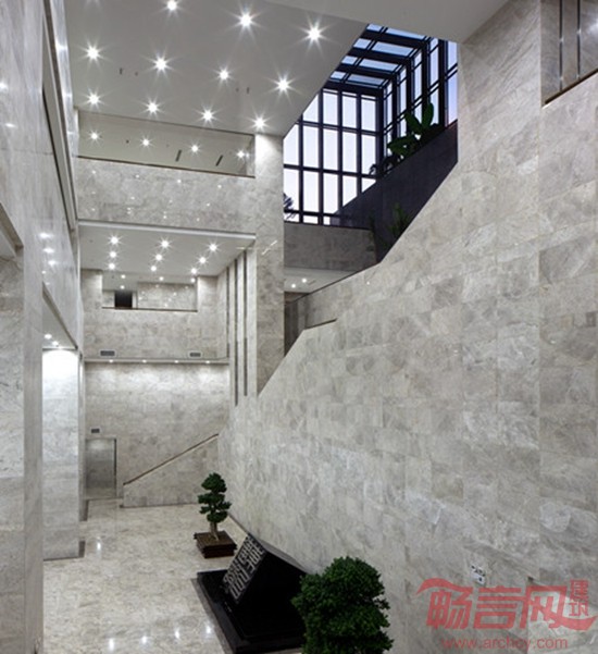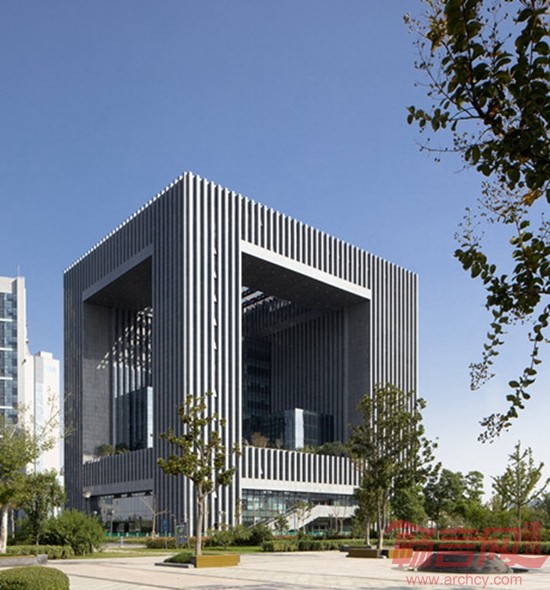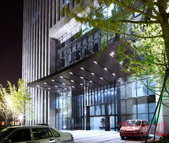 建筑形象依据构思自然生成,整体而独具特色。立面处理上,我们在竖向石材构件和玻璃幕墙之间寻求宜人的比例关系,其色彩对比强烈,在阳光下呈现明晰的光影效果。同时空中花园结合顶部构架的处理,外加玻璃的反射作用,营造了光影效果极为丰富而富有绿意的趣味空间。在本工程的设计过程中我们完成了各工种包括外幕墙、室内装修、景观设计、泛光照明的整体设计工作,使得整个建筑内外一气呵成,以简洁精练的语言体现了“新颖、独特、大气、稳重”“富有现代气息”的形象特点。