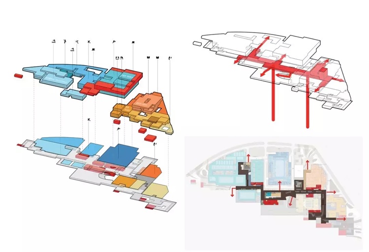 苏州高新区文体中心被当作城市空间和生活的一部分设计,17万平方米的巨大体量呈现为功能小模块的搭接,从而建筑的体量也得以消解,成为城市的一个有机组成部分。这种与功能紧密相扣的空间结构,正是“云形水石”概念的真正意义。在数字化的背景之下,建筑师们希望通过用一些简单抽象的方形体块,以一种魔方式、像素化的方式堆积在一起,来传达一种类似太湖石般精妙复杂的空间状态。凹凸的体块使空间产生一种“留白”,形式与功能的对应不再单一不变,多意和辩证的空洞结构的自主性可以通过复制和变异来适应环境,引导建筑自发生长而不破坏它的完整性。