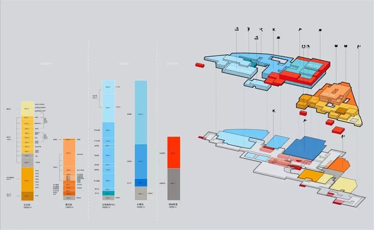 作为综合性文化体育建筑群,苏州高新区文体中心主要功能分为三大板块:文化空间、体育空间和商业空间,涵盖区文化馆、图书馆、体育馆、全民健身中心、影视中心以及室外休闲广场等配套设施。