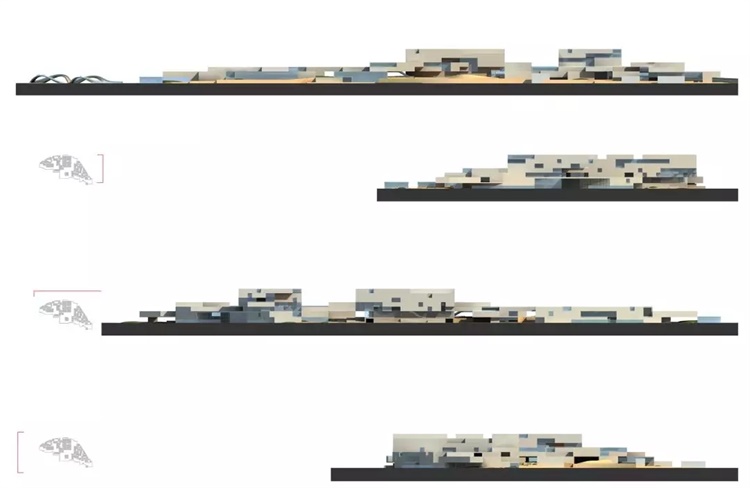 我们希望建筑成为山的延续,成为周边环境的一部分:延续原有的山体和石壁使整个建筑群体与环境融合在一起,在亲人的尺度下成为隐形于城市环境的地景化建筑,而不是一个高高在上、拒人于千里之外的庞然大物。