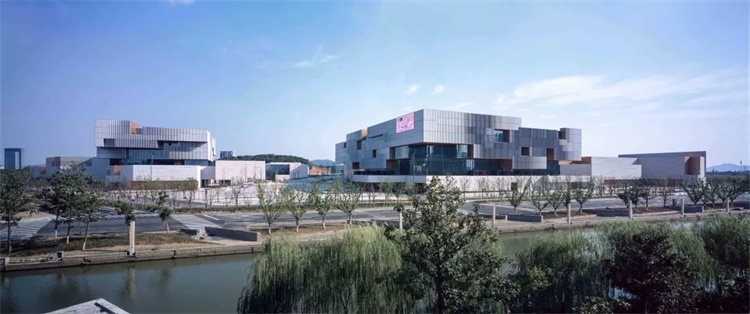 苏州高新区文体中心位于苏州科技城内,背靠小龙山,被太湖大道和浒光运河所环抱,占地三百余亩,馆室十七万方。其所处的地块曾是采石场,挖掘后留下的巨大石坑形成了湖面,而剩下的石壁环绕着湖的另一边,建筑师以地形的脉络作为概念设计的源头,延续原有的山体和石壁使整个建筑群体与环境融合在一起。