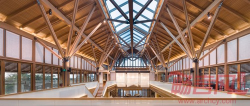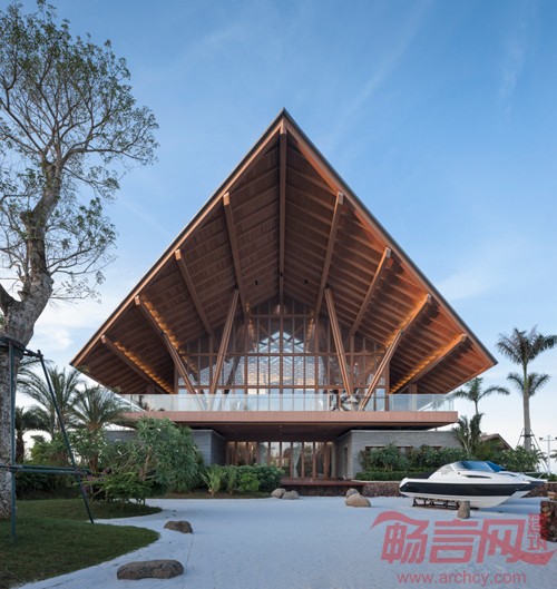 会所大堂内环绕中庭四面的大楼梯将上下两层空间贯通,正对大海,结构体系采用钢结构的分叉支撑起一个三维大悬挑的弧面屋顶,选择将梁柱完全暴露的做法让结构的美感和纤细的支撑构件与这“木屋子”合为一体,创造出层叠、变幻的韵律。通过材料与结构的轻盈使传统与时尚体现出隐含的融合,使场所的地域性得到进一步的表达和提升。