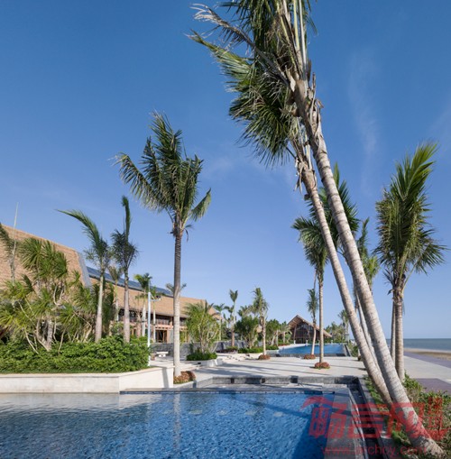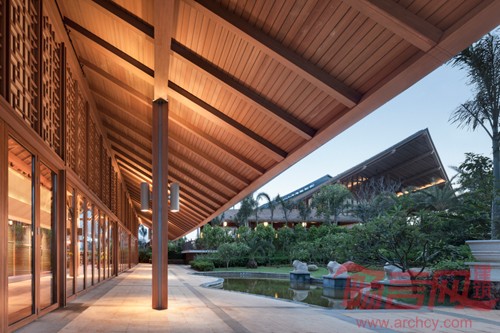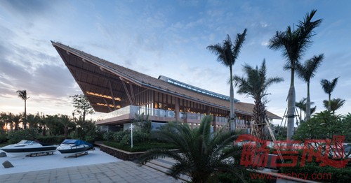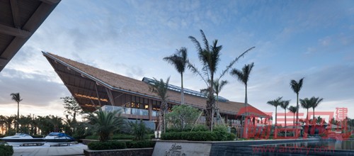海南沿海地区会受到海风及海水的侵蚀,要求材料具有耐候性、耐酸和腐蚀并且还能够抵抗台风,因此设计师选用了相比天然材料更加具有优势的天然茅草和生态木,在新材料的基础上进行了构造节点的创新与改造,体现结构之美、自然之美。