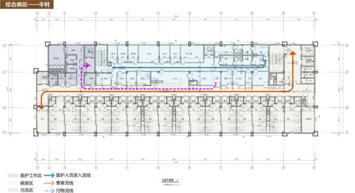 在传染病住院楼内部,平时医生查房后原路返回进行一脱、二脱回到清洁区。疫情时期,方案将原本的污物暂存与脱一置换,医生采取“不走回头路”的方式进行查房工作。