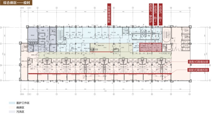F楼住院楼在初期建设时均按照呼吸类传染病住院楼要求预留风井及设备用房,当疫情来临时,在护士站加装玻璃隔断,原本的库房改造为穿脱防护的缓冲间,病房区域取消一张病床,将原本南北向的隔墙拆除留出病人通道,在南侧加装装配式隔墙,形成标准传染病区“三区两通道”组织形式。