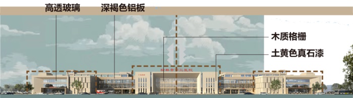 榆林是1986年国务院批复的第二批国家历史文化名城,拥有着悠久的历史和灿烂的文化。方案采用中轴对称的形制,立面体块上主次分明,整体庄重大气,方案选择土黄色真石漆为基底,粗糙的肌理更能体现出医院古朴素雅的气质。