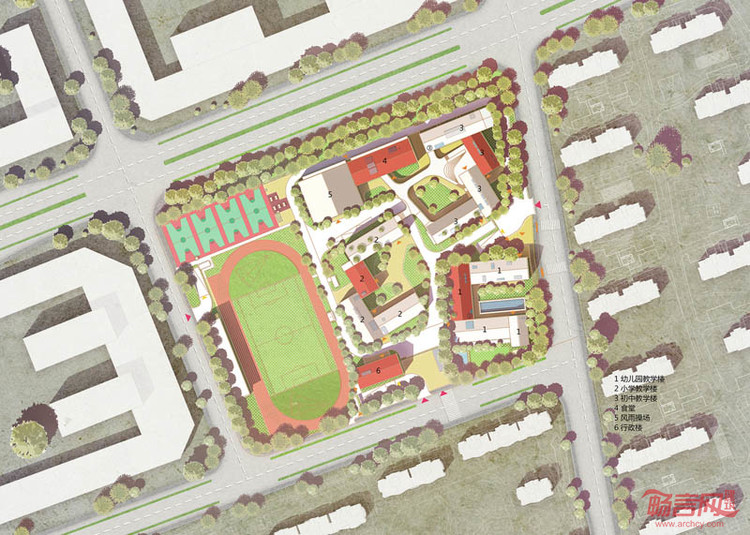 幼儿园是独立的U型院落,像张开的臂膀给孩子们围合的安全感;小学在形态上由四个四层的单元连接形成半围合的庭院,朝向中心步道广场打开;初中面向城市干道一侧的建筑相对统一规整,呼应城市界面。