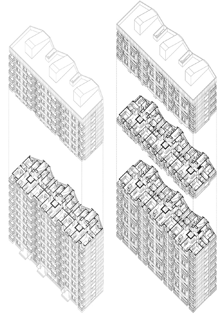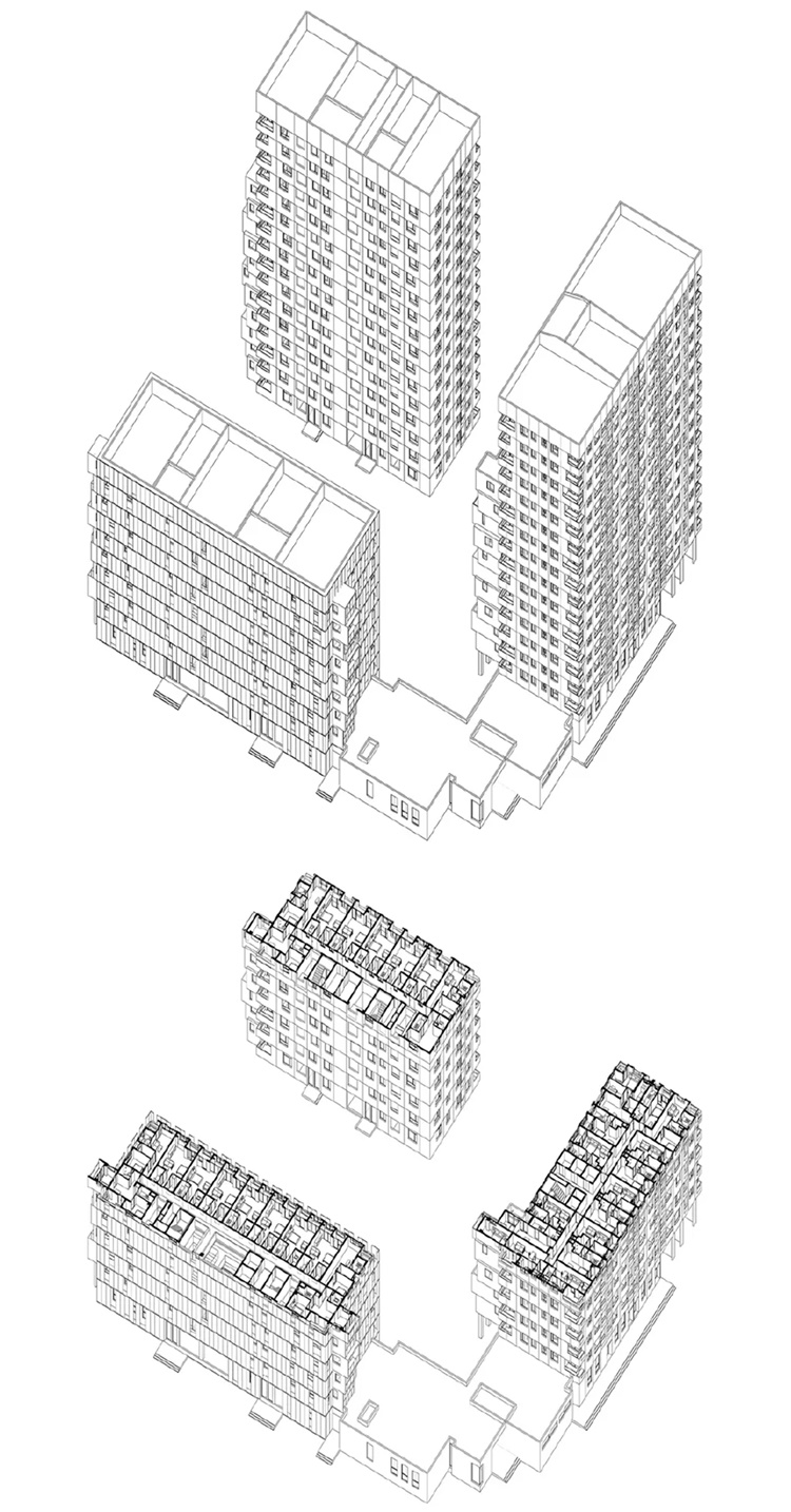 传统行列式住宅的外因是基于房地产利益最大化,内因则是规范中对于日照和朝向的严苛规定。而仅就规范的内因来讲,建筑师并没有真正挖掘其中的设计潜力。在本案的围合住宅和塔式住宅中,摒弃了传统住宅日照先行的先入为主,先通过容积率参数和控规参数进行住区建筑整体营造后,再充分利用日照的精确计算进一步挖掘建筑局部,从而产生了前所未有的住宅形态。这在手工计算日照的时代是不可想象的,在不假思索直接排排座的习惯设计中也无法触及。所以,未来的住宅设计乃至其他类建筑设计,从整体到局部、算法的深层挖掘似乎可以导出很多设计的“新手”,从而改变建筑师们僵化的思维,打破桎梏。