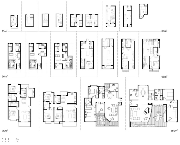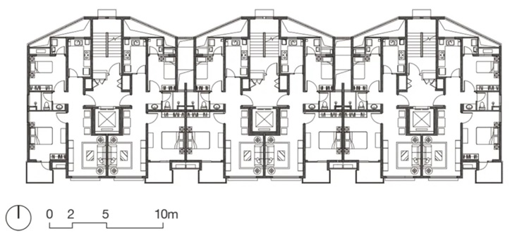如果改一下《老子》的名言为“围宅以为庭院,当其无,有庭院之用”,则可以阐述围合式住宅对于居住的意义。虽然国人自古便崇尚苑囿之乐,但行列式是近几十年来中国住宅的一尊教条,并几乎成为唯一。这是基于居住个体本身以及房地产利益最大化的结果,是一种较为简单低级的算法。而都市的利益计算以及群体反向对个体利益的促进是一种复杂参数,将一些没有必要的以及服务于少数人的个体利益,让渡于其他的更重要的群体利益,就可以导出一些别的形态,诸如围合住宅、塔式住宅等非单元板式的形态。这在全世界屡见不鲜,而在中国这个边界明显的地理区域出现了唯一性,在全球化生态里是不正常的。