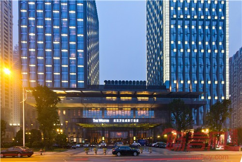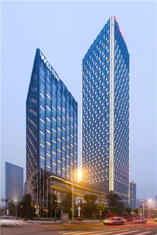 北侧威斯汀酒店20层,酒店客房总数量为308套,其中单双床客房282套,行政、豪华、殷勤、焕彩及总统套房等二十余套。裙房设有知味餐厅、思悦兹饼屋、中国元素餐厅、酒吧及雪茄廊、大堂吧、威斯汀私人雅间等。酒店还拥有超过2890平米的灵活会议室及多功能空间,1488平米的豪华宴会厅为举办活动提供了一个优雅迷人的环境氛围。南侧为42层181.9M高的超高层5A写字楼,设计服务人数为6000人。