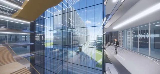 通过对科创企业的调研和对未来工作方式的研究,我们在园区设置更适合未来工作生活的创新场景。比如在中建总部内部植入60米挑空中庭,为各个楼层的人创造出让创新可见的空间氛围。同时形成晶莹剔透的建筑效果,将城市、湖光与建筑自然融合。
