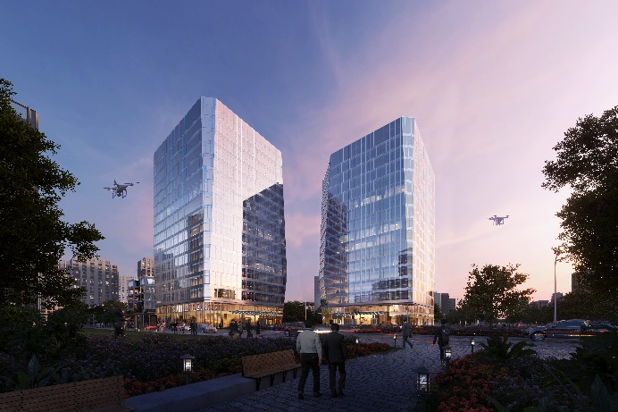 建筑造型以“雕琢”为灵感,通过削切的手法,切割塔楼形体,避免两座高层塔楼棱角相对,在体量的退让间形成以人为主体的舒适空间体验。极简的轮廓之下,设计采用横向的立面线条搭配通透的玻璃幕墙,抽象模拟钻石形态,诠释出坚毅与永恒。
