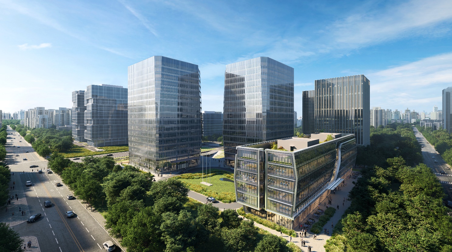 团队将绿色基因注入设计,使项目荣获绿建三星和LEED金级认证。立面采用三玻两腔外片半钢化搭配高反铝板,极大程度降低光污染以及室内能耗。并通过绿意盎然的中央形象广场、景观构筑物以及屋顶花园,营造出多层次绿色空间,与周边景观带及东北侧的城市绿化公园形成呼应,使建筑与环境和谐共生。
