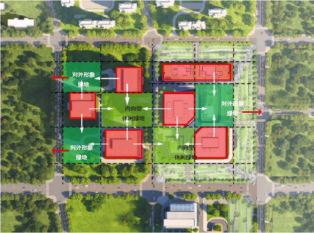 设计延续场地周边棋盘格布局,多层塔楼设置于地块北侧,两座高层办公塔楼于南侧对角线而立,形成错落有致的城市天际线。并通过多座建筑体量围合退让,在场地西南与东北形成了两个风格不同的广场,保持空间连续性和整体性的同时,增加场地的开放性,激发场所活力。其中东北侧的中央形象广场,作为城市绿芯,以绿意空阔的公共空间促进社交,营造舒适宜人的办公空间体验。西南侧紧邻行人进出的主入口,设计将其打造为大尺度的下沉式广场,打破场地视觉的单一性,并利用地下活力商业空间迎接往来人流,营造丰富的办公商业消费体验。整体动线人车分离,并在地下设置VIP落客厅,提升抵达仪式感。