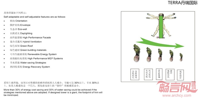 本项目的绿色设计策略具体措施包含了以下内容:维护结构、生态井、自然采光、高性能幕墙、混合式通风、绿色屋顶、绿色建材、可再生能源系统、高效能机电系统、节水措施、热回收系统。