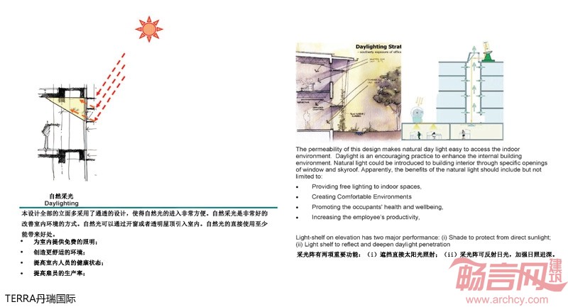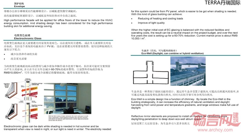 3、生态井(日光,可与通风相结合)是一种类似于烟囱功能的设计。通过将生态井设置于建筑内,可提高自然通风的效率,并可通过风能及温度变化获得自然光,同时大面积开窗可充分利用自然光。顶屋设置日光反射设备,为生态井引入更多自然光。