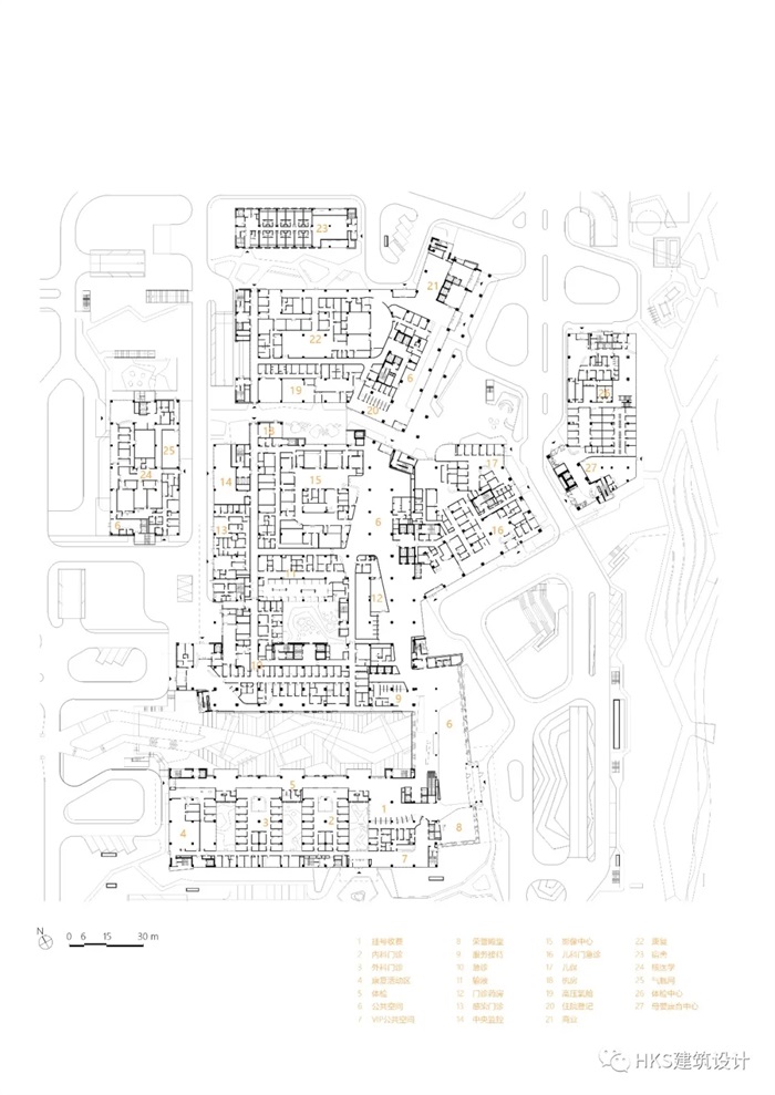 为了尽可能地形成朝南的景观视角,获取更多获取直接日照的病房,以及便于明确分期,整体平面布局呈风车形,由内核向外扩散。门诊面向内广场,便于广大公众识别,疏散与就医;从主要交通流线看去,急诊科及其抵达广场易于识别,便于到达。妇幼中心(一期住院楼)临河而建,这样的布局有利于月子中心面向景观优雅的疗愈区。VIP住院塔楼(一期住院楼)可俯瞰门诊大楼及其内庭院,二期的住院塔楼也因独特的平面布局可获得良好的河景视角。