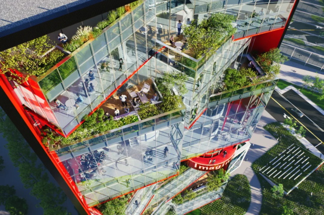 在此基础上,面对东、南、北三个方向环绕的高楼,建筑以严谨克制的姿态延续空间语境。而面向景观河道与开阔城市的山墙面则被大胆分解和重构,通过体块“切割”与“微扭转”,自然形成丰富的悬挑、露台与缝隙,构成一片充满张力和野趣的城市“立体森林”。该策略恰似中国功夫中的“寸劲儿”,并不追求浑身“蛮力”,而是将恰当的“力量”汇集于一处,瞬间迸发,面向“坚硬”的城市勇敢地“怒放”。