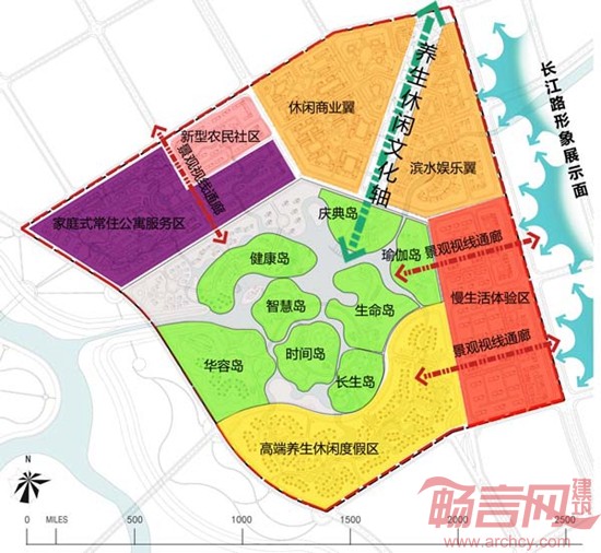 项目在基于哈尔滨多元文化的底蕴基础上,强化“健康养生、现代旅游休闲以及有机生态”三种文化。总体规划布局采用“岛状”形态,规划结构采用“一轴:养生休闲文化轴,两翼:休闲商业翼、滨水娱乐翼,四区:慢生活体验区、高端养生休闲度假区、家庭式常住公寓服务区、新型农民社区,多岛屿”的形式。利用不同形态的岛状布局,形成一个富有生命力的旅游度假社区。