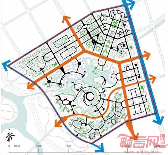 哈尔滨天汇医疗休闲旅游小镇的绿地系统规划本着生态优先、易近易达的原则,结合新城市主义的五分钟步行法,点、线、面结合成绿色生态网络。社区中心绿化廊道通向水面,作为通风廊道,改善区域微气候。通过公共绿地内的水体、水街等将城市内部的绿色网络与阿什河水体建立联系。每个社区中心开敞绿地与滨河、景观走廊直接连接,两者充分渗透。区内借阿什河廊道的价值,提供一系列的水岸处理形式,形成绿色生态岸线与娱乐活动的有效结合,承载文化类型多样的滨水资源。