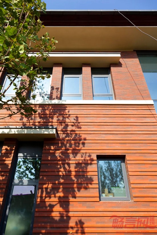 “每一种材料有自己的语言……每一种材料有自己的故事。” 售楼中心尊重天然材料的特质,选用了天然感较强的红砖、文化石、锈板、以及室外防腐木作为主要装饰材料,富有原始风貌的材质体现出崇尚自然、尊重环境的理念。