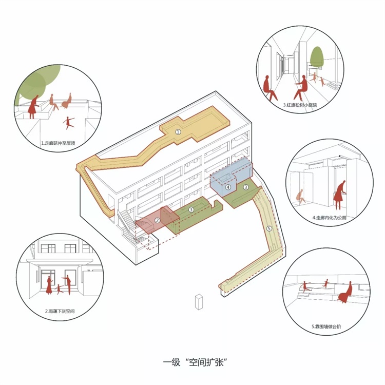 功能所对应的空间改造策略以小学特有的外廊式框架承重墙结构为基础,利用原教室与办公两种面宽尺度(5.1米、3.5米)的差别,植入枣园餐厅、老年人活动中心、公共卫生间、大通铺、标准间等新功能空间。以小学公共外廊空间为枢纽,在楼层上下扩展、延伸。通过深、浅空间的再造,与日常行为、景观视野的连结与强化,触发新空间的诞生。