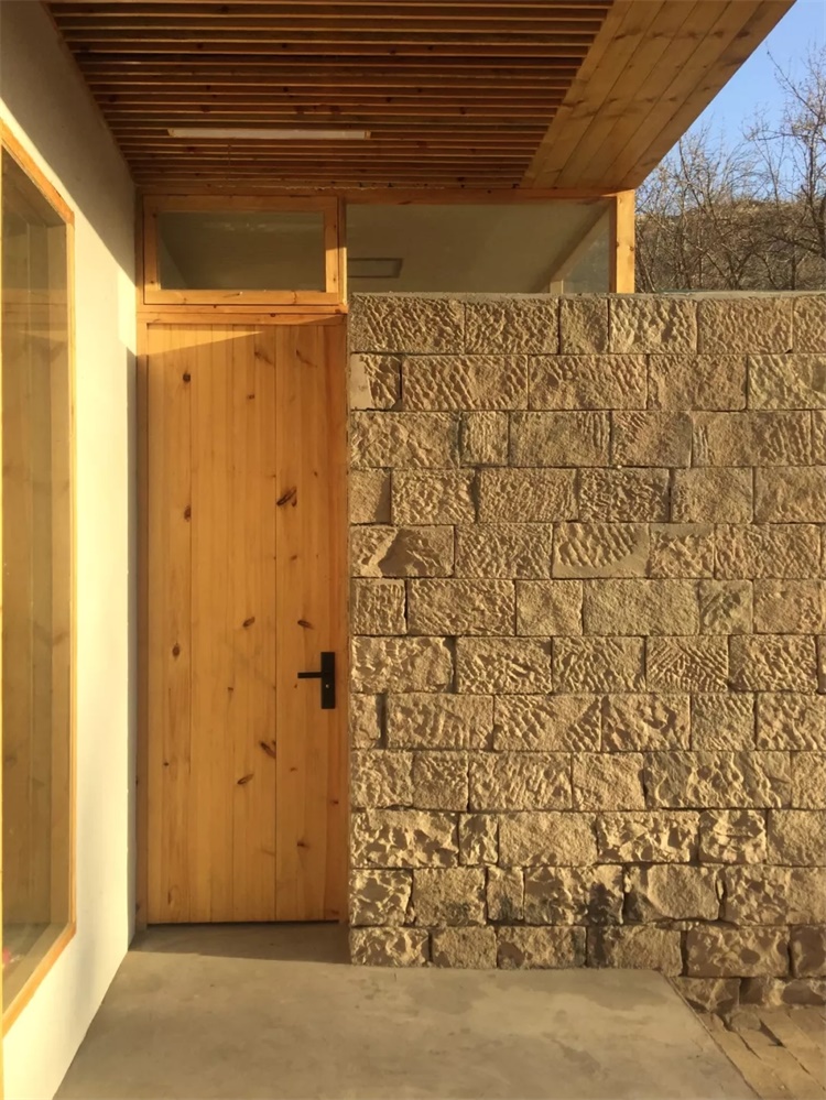 同时,石墙从建筑外廊扩展出来,包裹住小学的旗杆、松树,形成门前浅院,“开章小学”几个大字顺势从楼顶移下,镶入庭园石墙中,原来的小学纪念碑记也从角落里搬出来,嵌入楼梯入口石墙内。在一层院落的石头空间中保存着小学的记忆片段。
