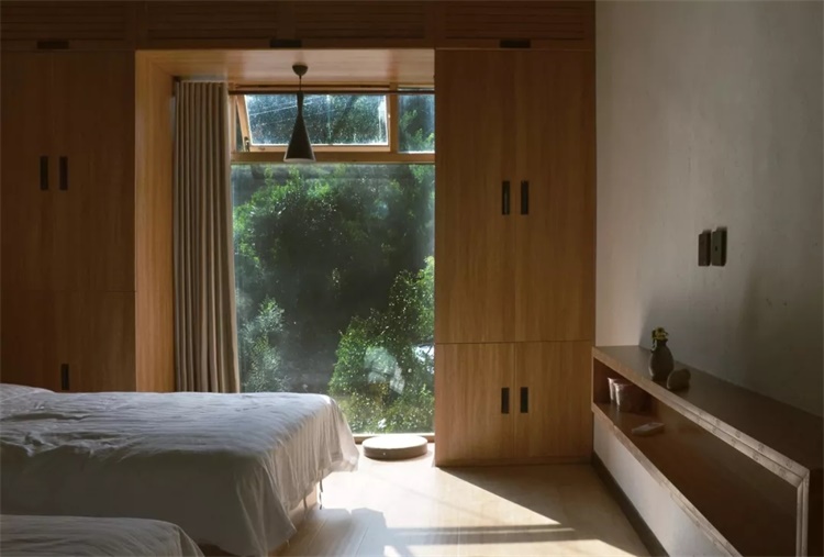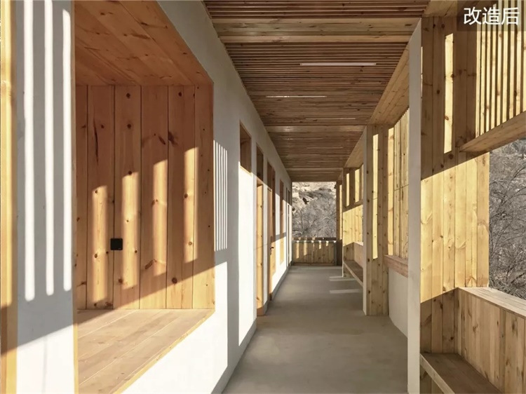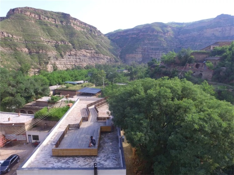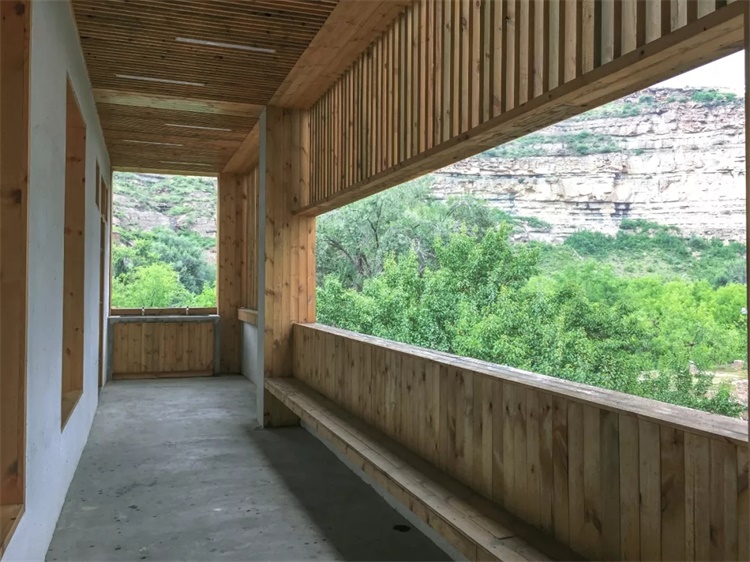 小学层叠的外廊空间,在空间的游走或坐倚靠立中,调节内部与周边山水聚落的视野层次,框山纳河,俗屏佳收。人们亦可在客房落地窗前坐望后山的窑洞聚落,享受风景和慢时光。