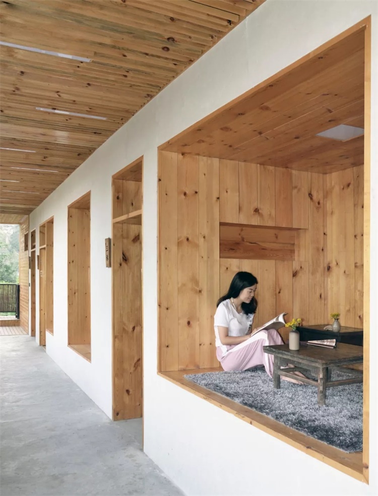 原小学外廊狭长单调,改造利用窗墙厚度与柱间宽度,置入长凳、倚台或茶室凹间、洗手池等家具空间,并压低走廊高度与外廊视野,让其更贴近人体尺度。通过浅空间的再造,为外来客人提供更丰富的交流和休闲空间。