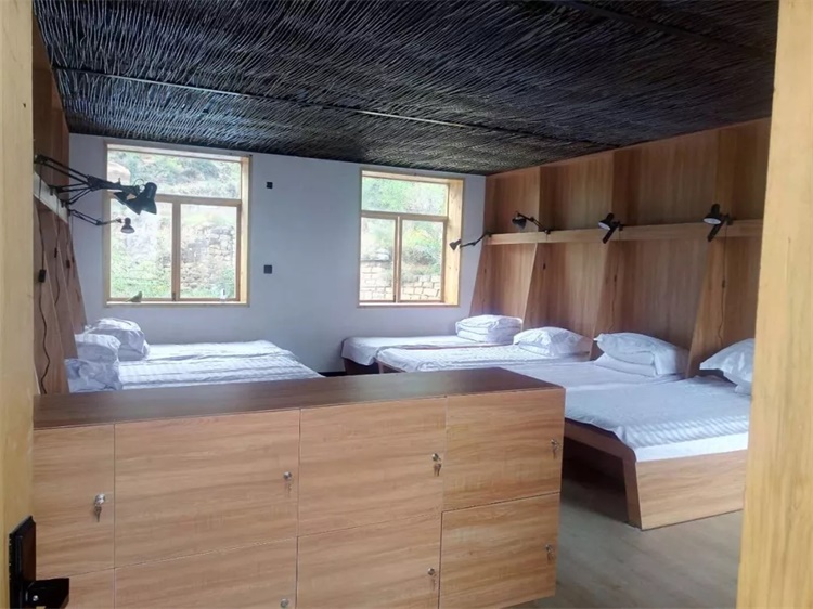 外廊内侧新植入的枣园客栈依据原教室与办公室大小空间的差别,分别设置了大通铺与标准间,在原本较高的空间内运用当地特色的柳编枣框工艺制成吊顶。大通铺可接待画家、学生等集体游客,延续集体生活的记忆;标准间则主要面向个人和家庭。小学新的运营功能吸引了村里外出务工的年轻夫妻回乡管理、创业,成为泥河沟村第一个有较大接待能力的客栈。