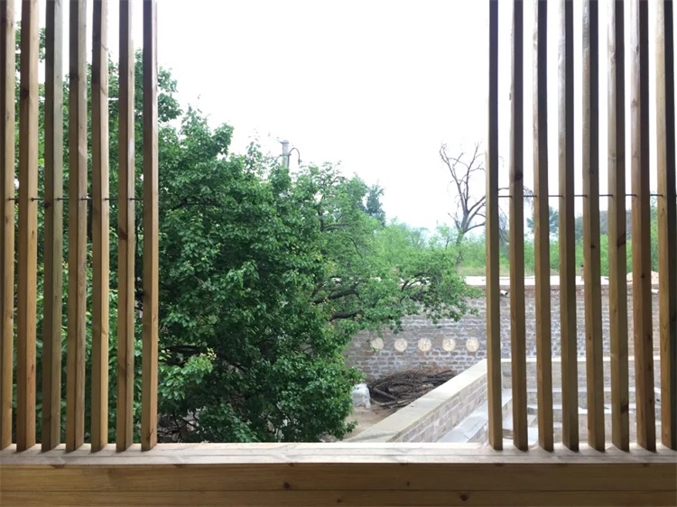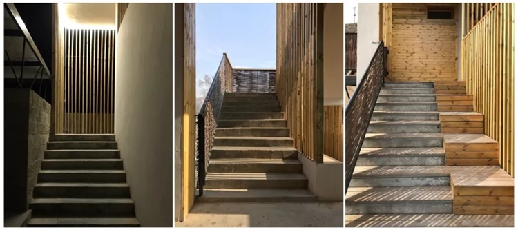 改造依据楼梯间在各层的视野与行为差异,由一层石墙的遮蔽到二层格柵的间隔再至三层的开敞,并在三层踏步一侧设置小坐台,可行,可坐,可小观。