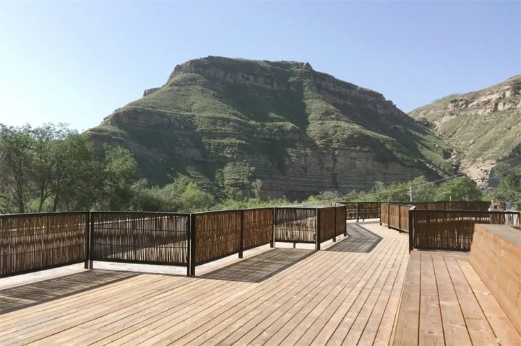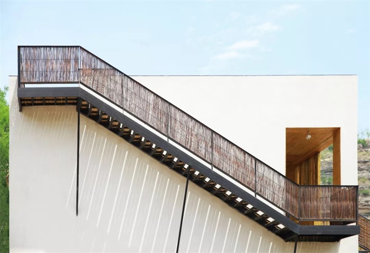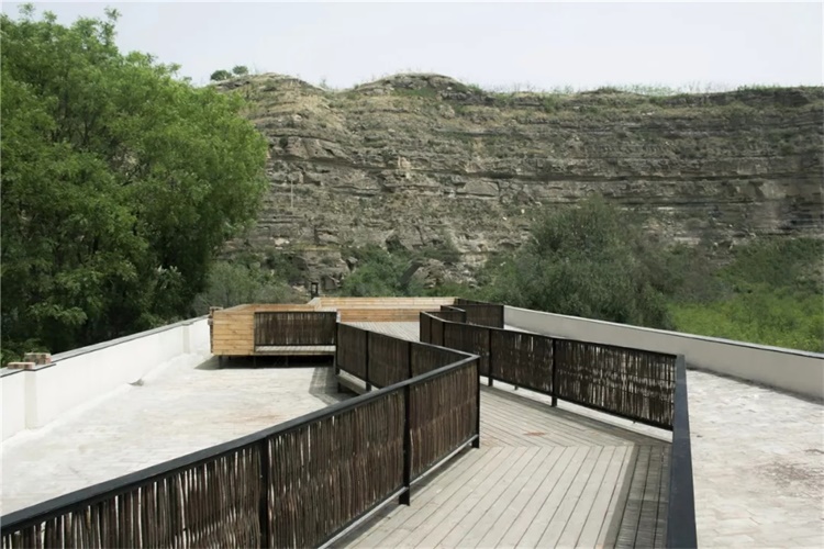 再往上通过增设的侧墙柳编钢梯,折入屋顶长廊,直至老槐树边的坐台,曲折尽致,空间豁然开朗,古枣林与黄河崖壁胜景尽入眼底。