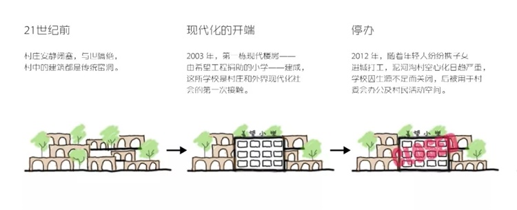 2000年以前,泥河沟这个佳县最偏远的村落,一直保存着完整的山地箍窑聚落群。在村民们的记忆中,不论是建国前的私塾学堂,或是五十年代租用的四孔窑办学,到六十年代新建的六孔窑和七十年代山顶的十一孔窑,均属传统窑洞并用作教学。而窑洞空间狭小,坡陡石滑,村民们一直想盖一座像外面一样的“真正”的小学。