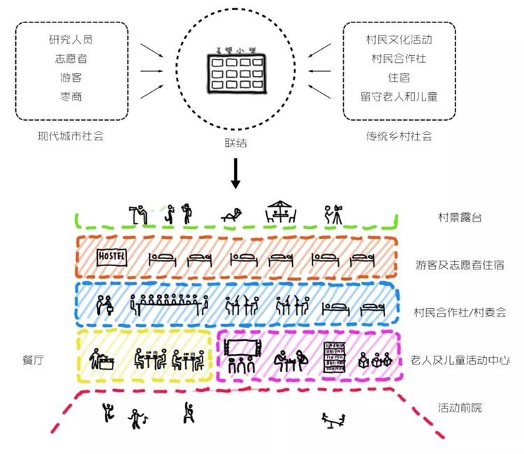 小学是村里除了庙宇、戏台以外仅有的集体产权建筑,改造后在沿用作村里的办公、活动空间之外,其使用对象也将包含进入村子的志愿者、画家、游客等城市人群,多样化的功能需求与植入如同一个“乡村综合体”,在延续村集体原使用功能的基础上增强其开放性与可持续运营能力。通过三层空间及屋顶平台的垂直差异性组织,形成由公共活动空间到办公、住宿、观景的纵向分层。