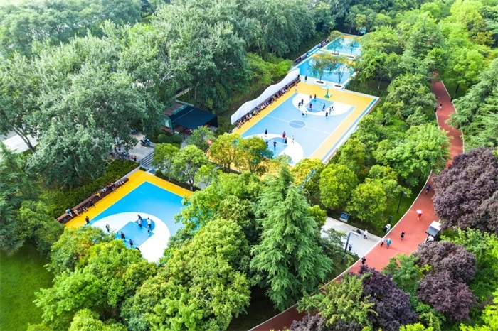 在篮球场区域,本次设计拒绝快餐式的功能更新,把激活运动需求和活力潜能作为出发点。篮球场的改造,以缤纷的地面色彩搭配和艺术造型感的周边围网,营造出一种自由放恣的运动气质。