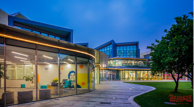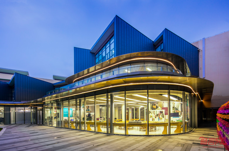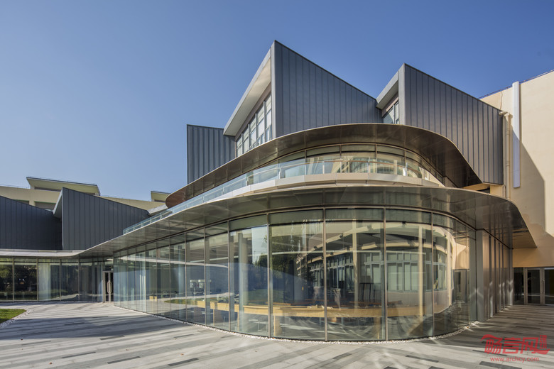 作为一个拓建项目,在设计过程中设计师充分考虑并尊重未来新建建筑与现有建筑以及景观的结合。通透的玻璃幕墙使四季的草木枯荣,户外景观都能随着自然采光一起投射进入室内,与室内延展出去的铺地融为一体。建筑外型上设计师使用了高规格品质的拉丝不锈钢雨棚,并且配合其细部的设计在视觉上达到了最大化的纤细度以及体现出整个设计弧形的动感灵动性。