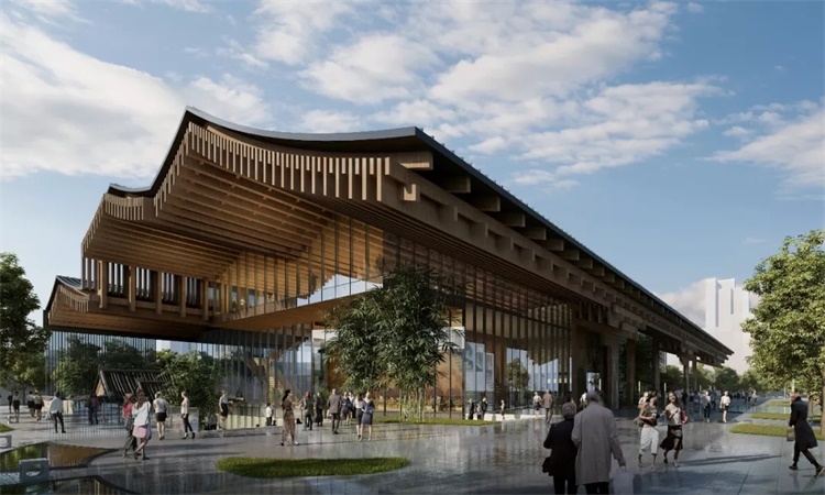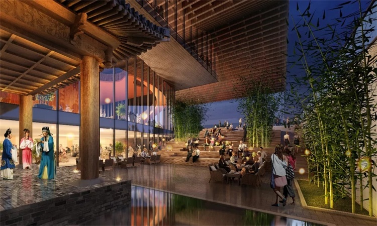 在传统 建筑的形体上增加现代城市元素,并通过结构向外部延伸,增加外围城市空间领域,将紧张的用地更多地留给城市,提高文化聚集度,形成区域人群茶余饭后可“遮风避雨”与“文化休闲”的城市场所。